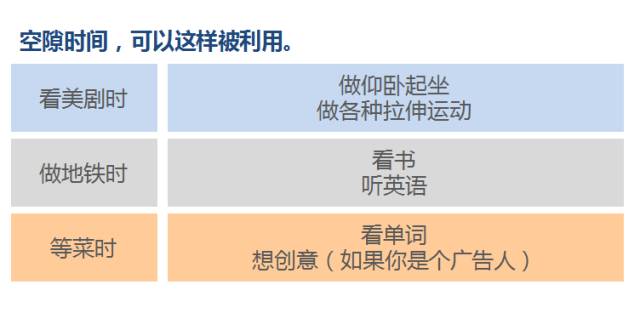 我们每天都有很多空隙时间。所谓的空隙时间,就是你早上起床穿衣化妆、坐在交通工具里无所事事、窝在床上看美剧等等时刻。这种时间应该被更大化地利用起来,它们看起来都像碎片一样小,但实际上它们累计起来也是一笔很大的财富。