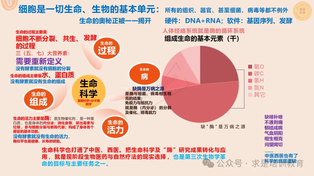 随着科技的进步,生命科学已经非常清晰地解剖了生命的组成与结构(蛋白质与水)、生命的过程(基因及细胞的分裂过程)与生命的源泉(能量与活力的机理)及万病之源;按照生物学科学家的观点,酶(活性酵素)是生命之源,没有酵素(酶)就没有生命,缺酶是万病之源。补充外源性的活性酵素,有助于人类的健康与长寿(以上摘自诺贝尔生理学与医学奖获得者的文献)。酶的意义不仅仅在于催化食物与养份、排出毒素与垃圾、直接参与新陈代谢及细胞分裂过程(如端粒酶,2009年诺贝尔奖);就是生命之源。